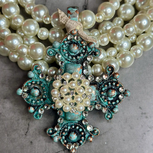 5 Strand Pearl & Patina Cross Necklace