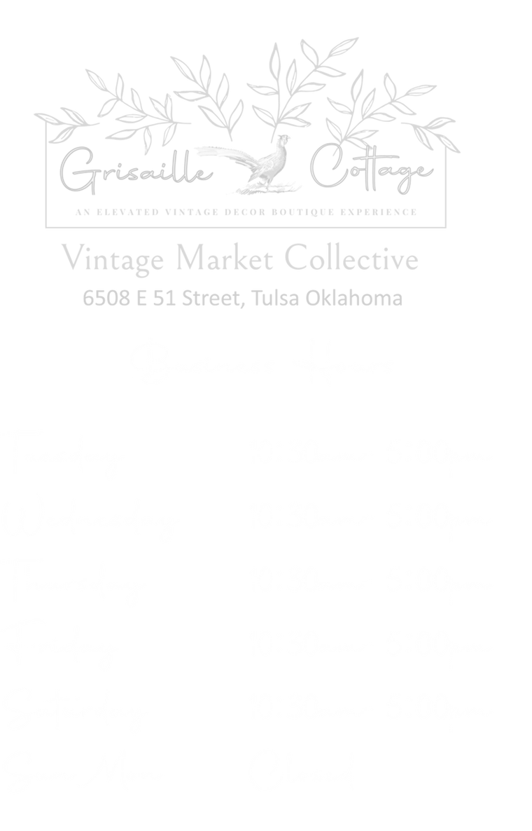 4) Mail your return with US Postal Service with a Tracking Number to: Grisaille Cottage Returns, 13859 S 200th East Ave. Broken Arrow OK 74014