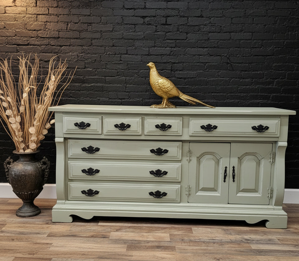 This pre-loved piece measured 72" x 20" Deep x 34"Tall, and has been cleaned, prepped and painted in a Chateau Grey (a muted deep sage gray), Lightly Distressed and features beautiful wildflower design on the top. This cabinet also features seven visible drawers and 3 hidden drawers behind the cabinet doors.