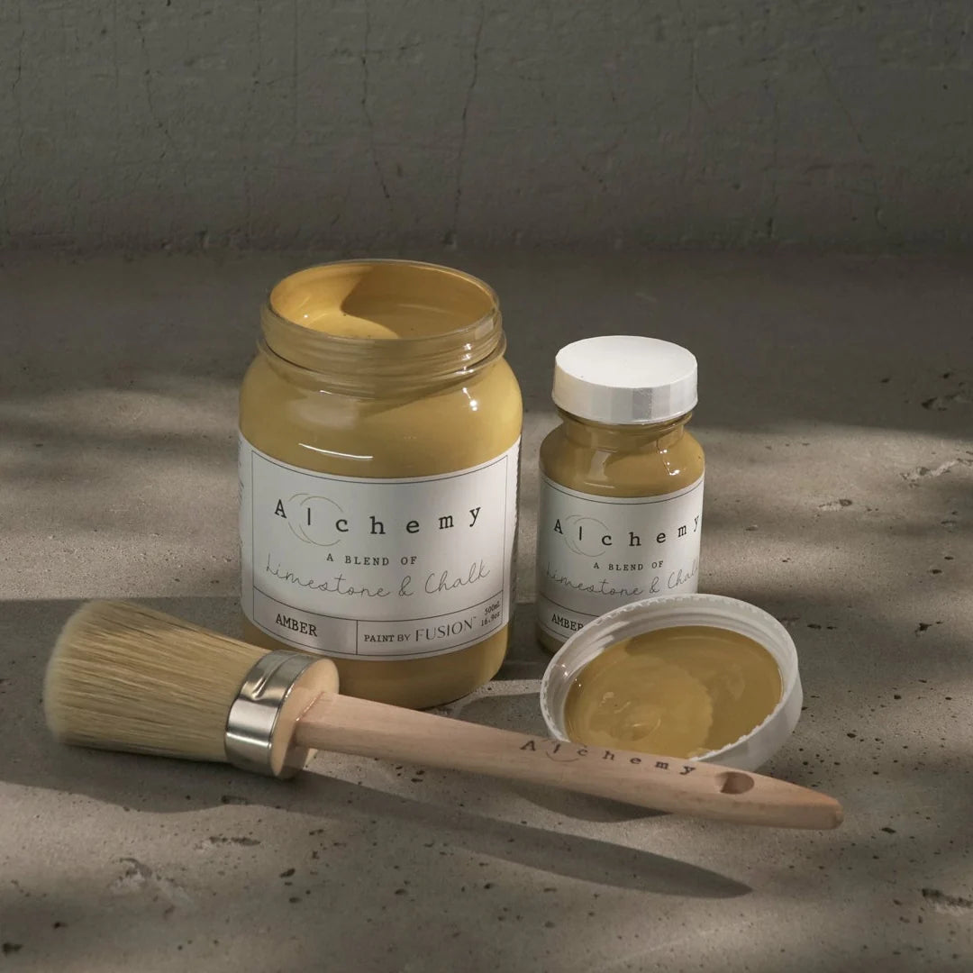 Alchemy by Fusion is a chalk-style paint known for its flat, chalky finish and artistic flexibility. It’s highly pigmented and a little thicker in texture, highly blendable, easy to layer and distress, making it perfect for achieving unique, textured looks. Adding a touch of water or misting while painting is a common desire among painters and it works very well with Alchemy. Fusion Mineral Paint has a very high built-in durability and a modern, self-sealing finish, Alchemy allows for creative freedom by letting you choose your preferred topcoat or leave it as is for a soft, flat vintage look.