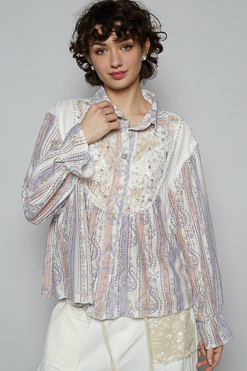 Designed in balloon sleeve A-line shirt top in printed lace with lace patch, pearl and jam stud, metal button down, vintage washing, paisley pattern
