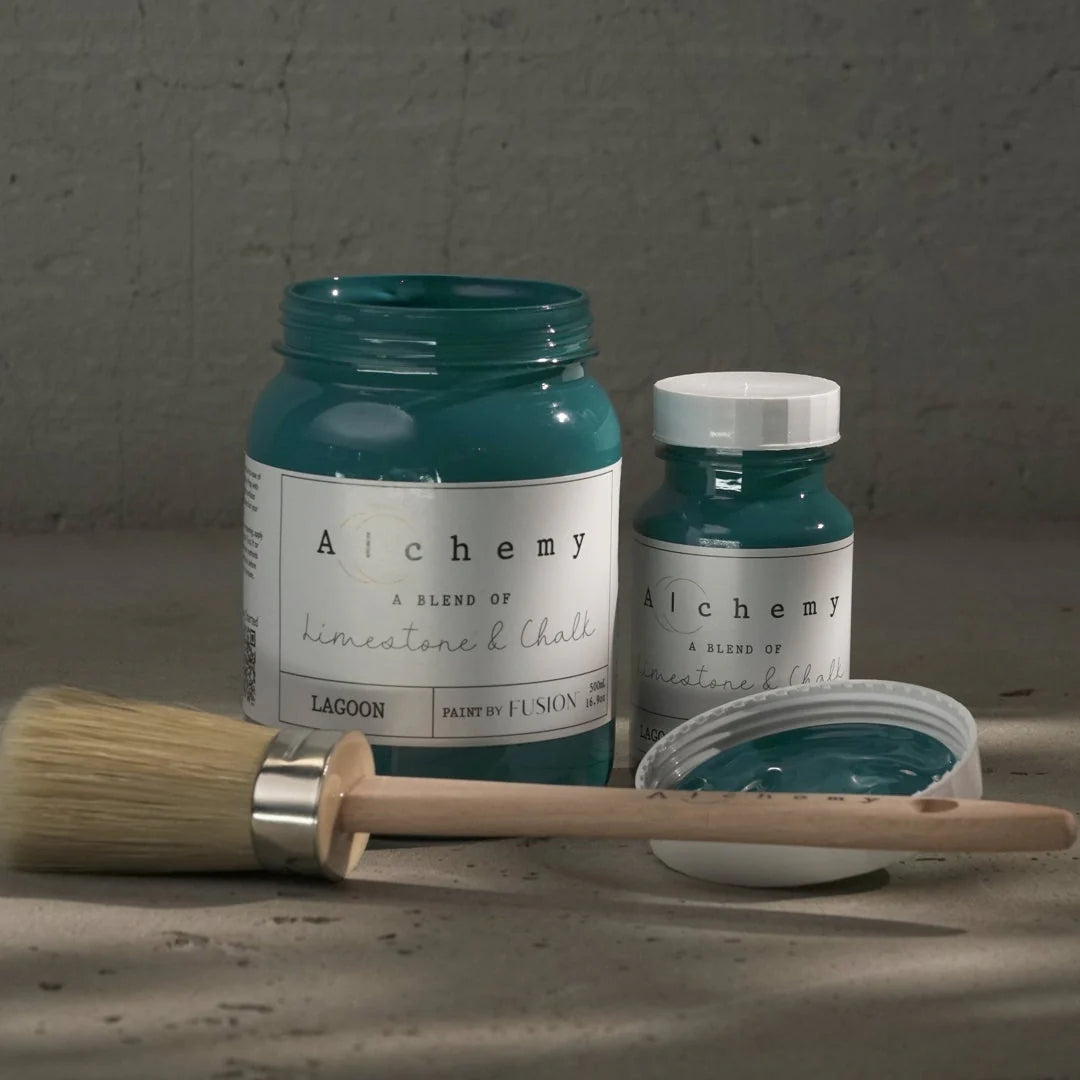 Alchemy by Fusion is a chalk-style paint known for its flat, chalky finish and artistic flexibility. It’s highly pigmented and a little thicker in texture, highly blendable, easy to layer and distress, making it perfect for achieving unique, textured looks. Adding a touch of water or misting while painting is a common desire among painters and it works very well with Alchemy. Fusion Mineral Paint has a very high built-in durability and a modern, self-sealing finish, Alchemy allows for creative freedom by letting you choose your preferred topcoat or leave it as is for a soft, flat vintage look.