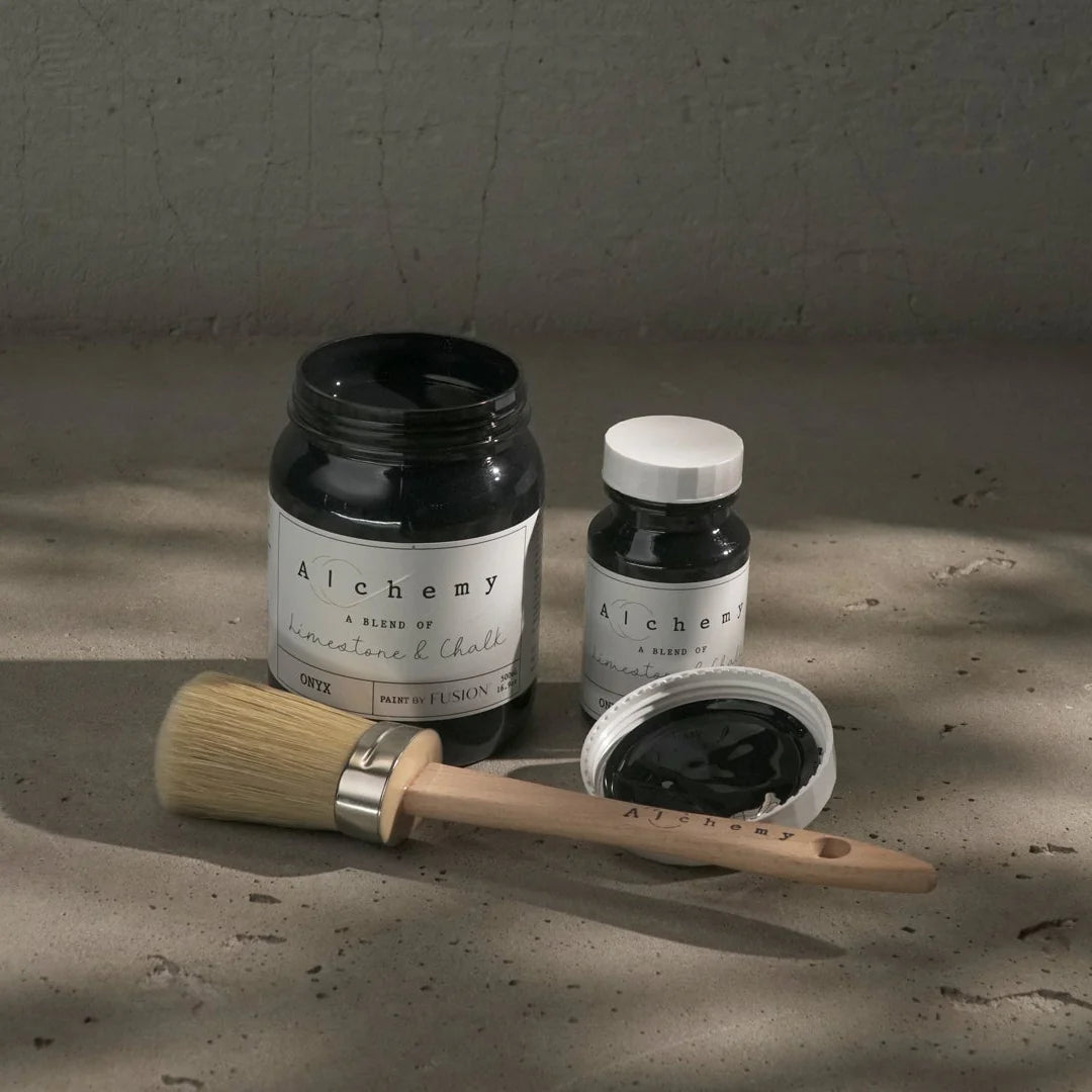 Dark, ultra-matte finishes like Alchemy’s Onyx are stunning, but they do come with a few quirks. Because Alchemy is a chalk-style paint and does not have the built-in topcoat that Fusion™ Mineral Paint does, darker colours can show fingerprints, light marring, and dust more easily when left unsealed. These aren’t flaws—just part of the character of true flat finishes—and they can often be wiped clean with a damp cloth.