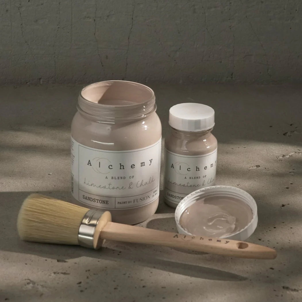 Alchemy by Fusion is a chalk-style paint known for its flat, chalky finish and artistic flexibility. It’s highly pigmented and a little thicker in texture, highly blendable, easy to layer and distress, making it perfect for achieving unique, textured looks. Adding a touch of water or misting while painting is a common desire among painters and it works very well with Alchemy. Fusion Mineral Paint has a very high built-in durability and a modern, self-sealing finish, Alchemy allows for creative freedom by letting you choose your preferred topcoat or leave it as is for a soft, flat vintage look.