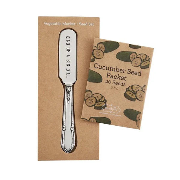 Adorable Stamped Silverplate Utensil & Seed Packet Set. Our veggie marker and seed set comes as a 2-piece gift set. Each set contains a humorous stamped silverplate utensil garden marker with a printed kraft paper vegetable seed packet.